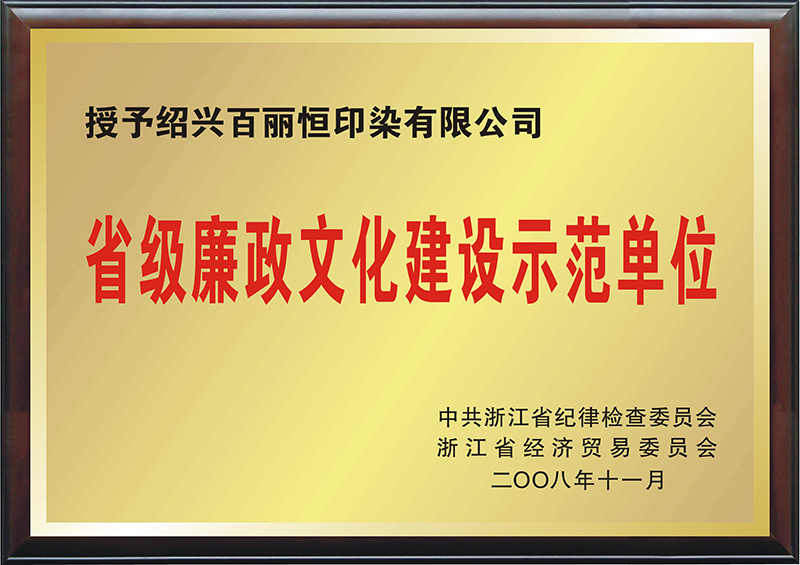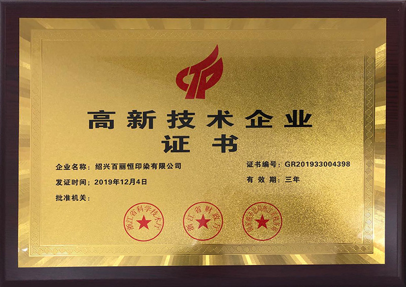 公司已先后通過了ISO9001:2016質量管理體系認證、ISO14001:2016環境管理體系認證和OEKO-TEX 100瑞士綠色生態紡織品認證,先后被授予中國印染行業企業文化建設優秀單位、浙江省綠色企業、全省廉政文化建設示范單位、全省能源計量示范企業、省科技型企業、市高新技術企業、市勞動關系和諧企業、市成長型工業企業20優、市環境友好企業、市節能標兵單位等榮譽稱號。